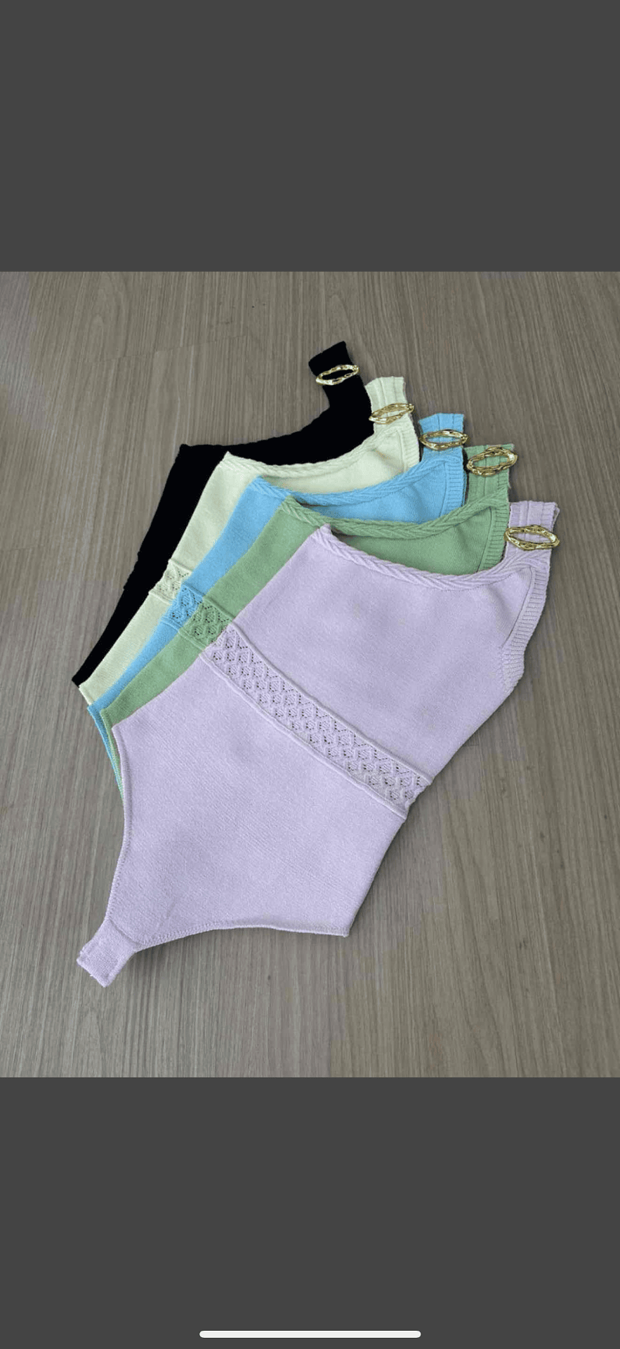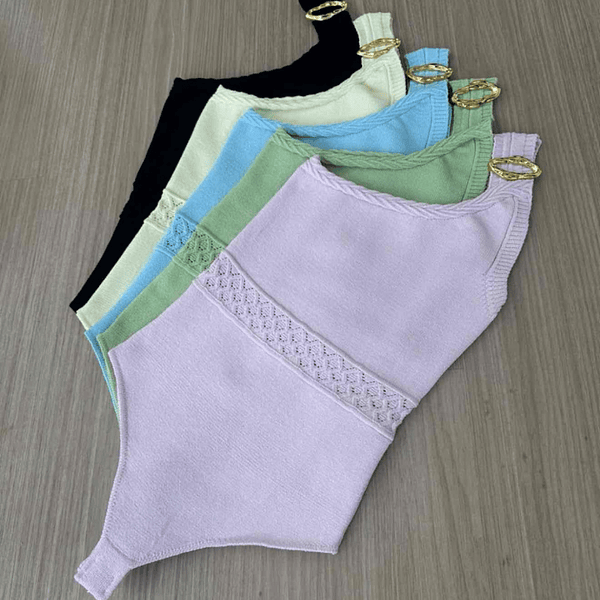 Possui detalhes trançados delicados e argolas douradas nos ombros, que trazem um toque sofisticado e moderno à peça.