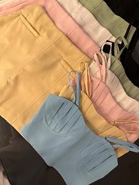 Conjunto em alfaiataria leve e estruturada, composto por cropped com recortes drapeados e short cintura alta com bolsos frontais.