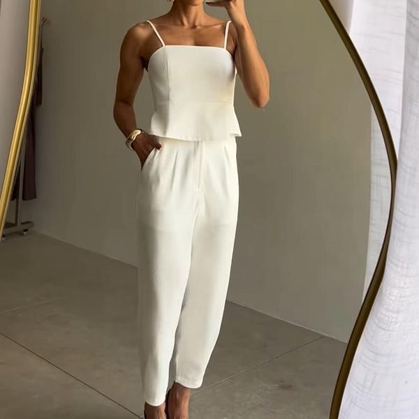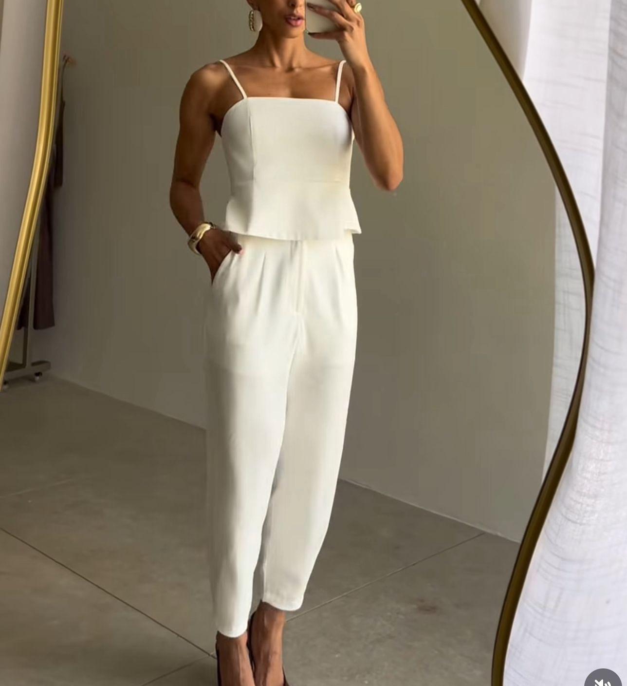 Conjunto em tecido sensory premium, com blusa de alça fina e modelagem estruturada que valoriza o corpo, e calça cenoura com bolsos, garantindo conforto e um caimento perfeito.