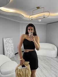 O cropped possui alcinhas finas e recorte reto, enquanto a saia de cintura alta conta com recorte lateral moderno, agregando estilo e sensualidade na medida certa.