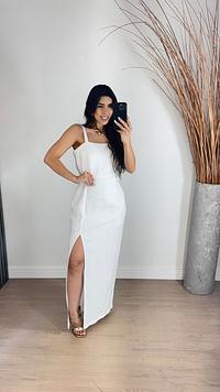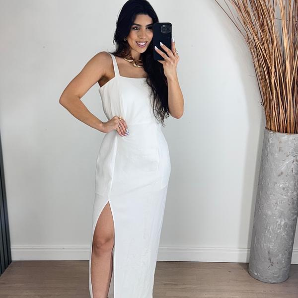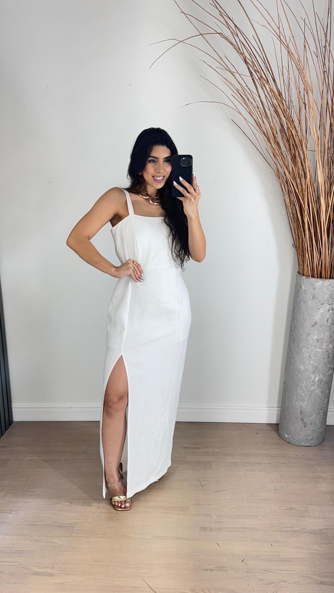 O destaque fica por conta da fenda lateral, que valoriza o corpo com elegância e modernidade.