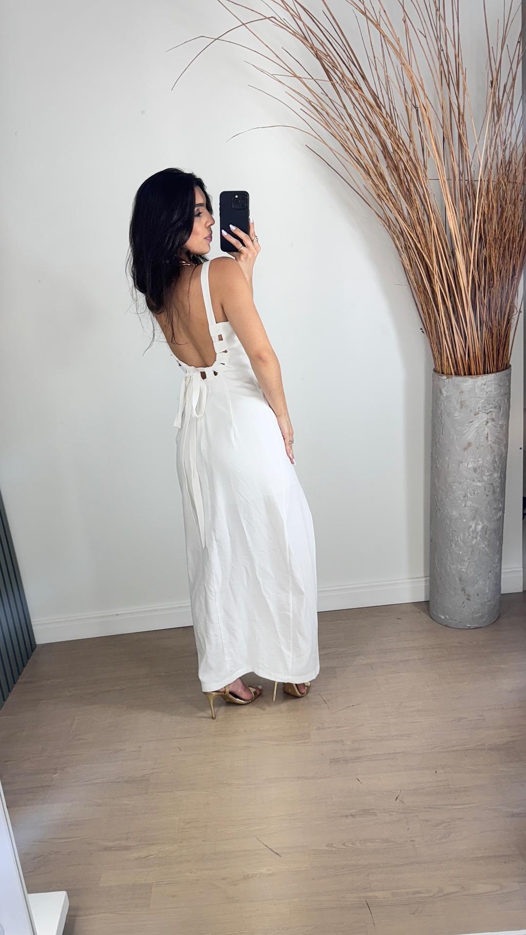 Vestido longo em tecido leve e fluido, com modelagem acinturada, alças finas e amarração nas costas, garantindo um caimento perfeito e toque sensual na medida certa.